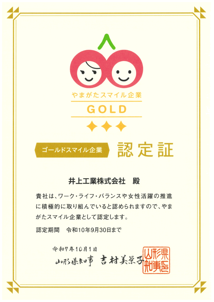 この度、山形県が「ワーク・ライフ・バランス」や「女性活躍」の推進に取り組んでいると認められる企業などを認定する「やまがたスマイル企業認定制度」で、弊社が『ゴールドスマイル企業』に認定されました。