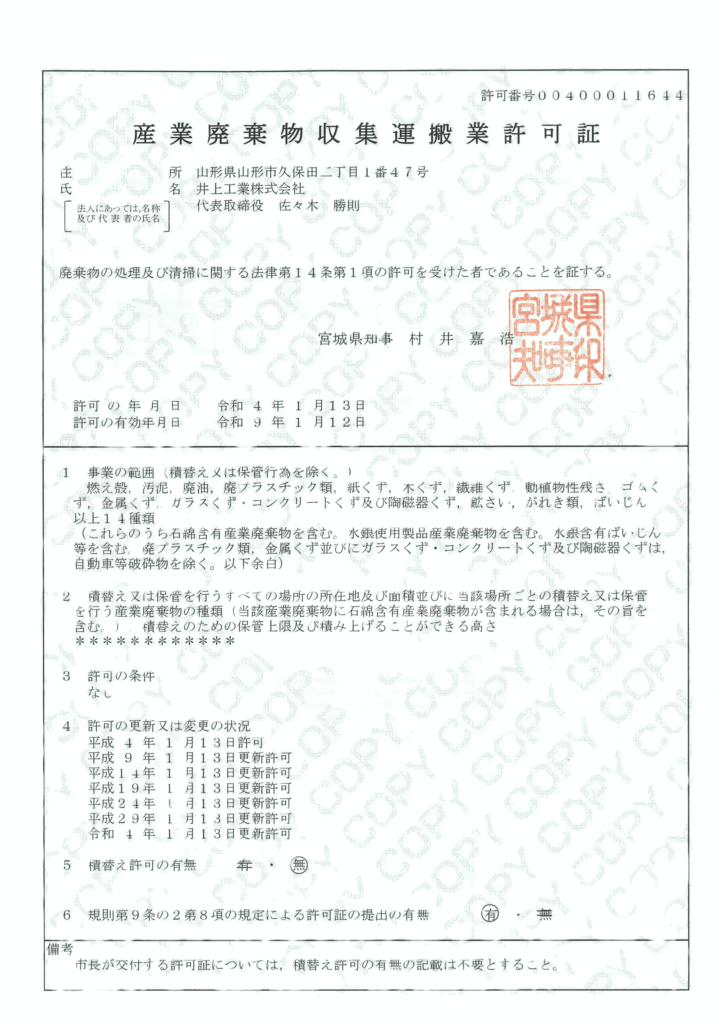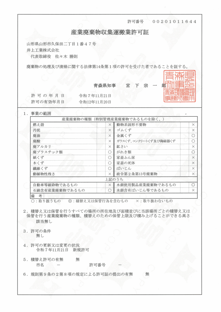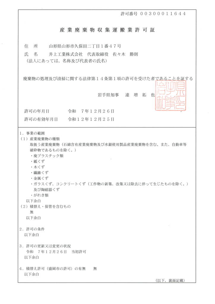 東北地方全域の収集運搬業許可証を取得しました 2026年2月9日 最終更新日時 : 2026年2月9日 inoue-i.com 平素は格別のお引き立てをいただき、ありがとうございます。この度、弊社では福島県・宮城県・秋田県・岩手県・青森県の東北地方全域の 収集運搬業許可証を取得しました。許可証は下記をご確認ください。