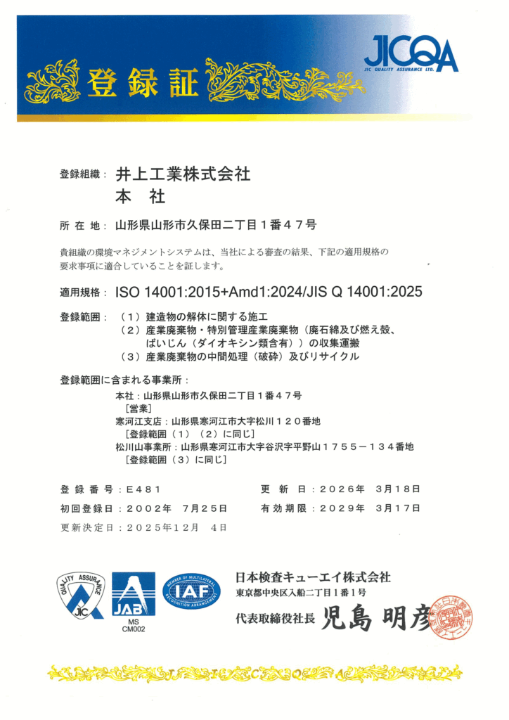 | 平成23年 7月 | 山形県優良産廃処理業者認定 (産業廃棄物収集運搬業・特別管理産業廃棄物収集運搬業) |