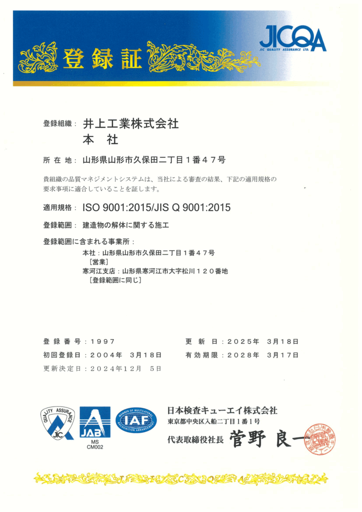 | 【 庄内営業所 】 〒999-7672 山形県鶴岡市柳久瀬字武良免1-10 TEL:0235-78-3433 FAX:0235-64-0188 (※庄内営業所はISO登録対象外) | ![]() |